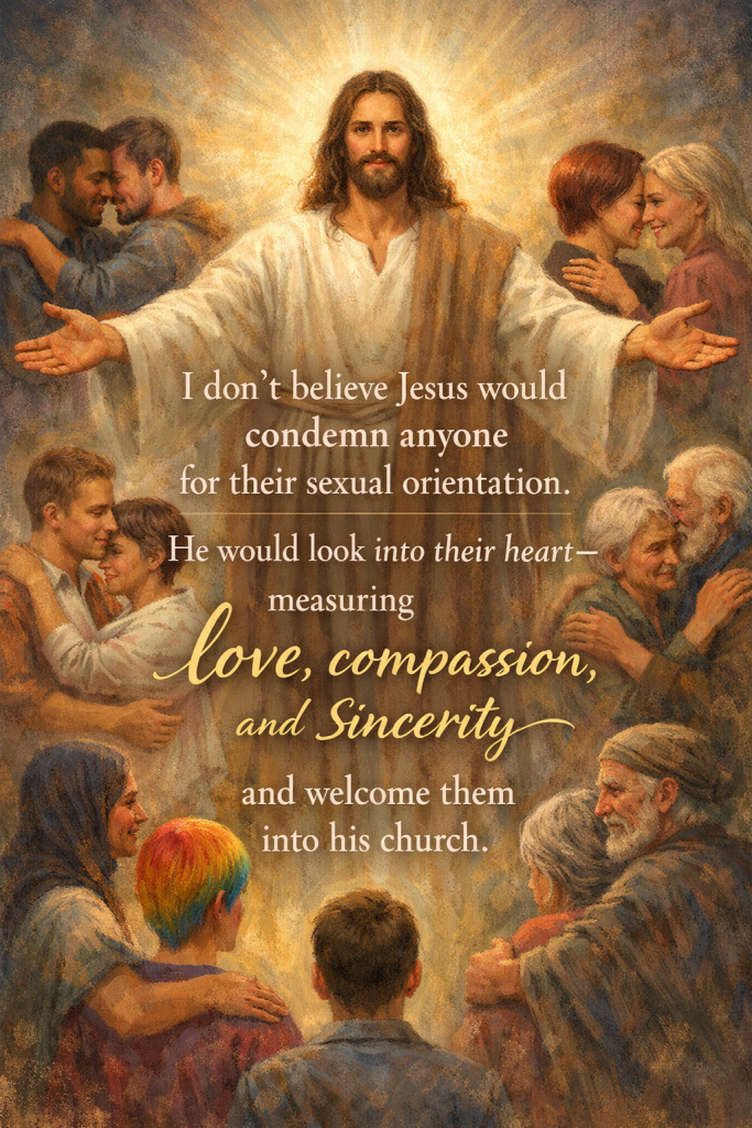 I don’t think Jesus would condemn someone based on their sexual orientation. He would look into their hearts to see if it was full of love and then welcome them into his church.
