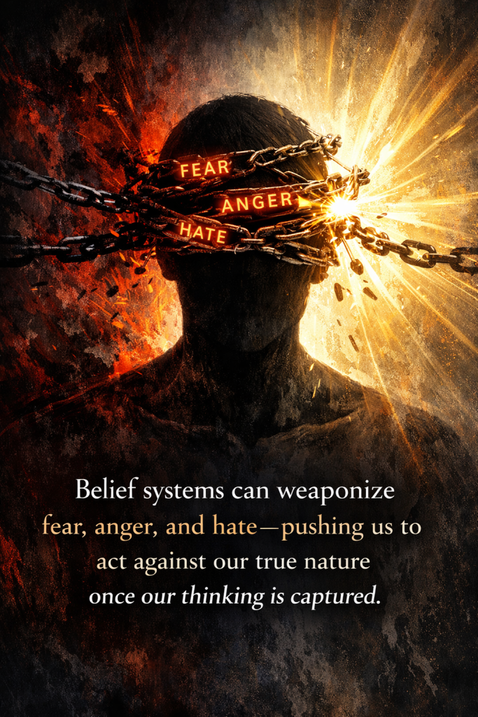 Belief systems use fear, anger, and hate to drive us to do things we would not do outside of the belief system which captured us.