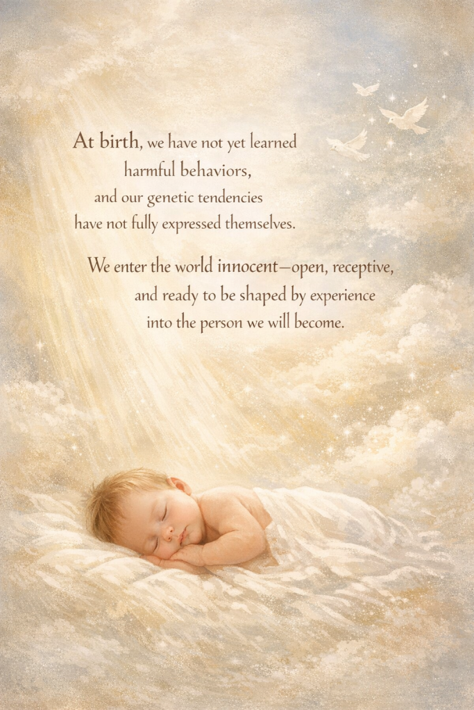 At birth, our genetics have not kicked in and we have not learned bad behavior. We are truly innocent and ready to be molded into the person we are destined to be.